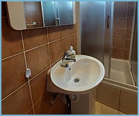 TV, kitchenette with a dining area and a bathroom with a shower.